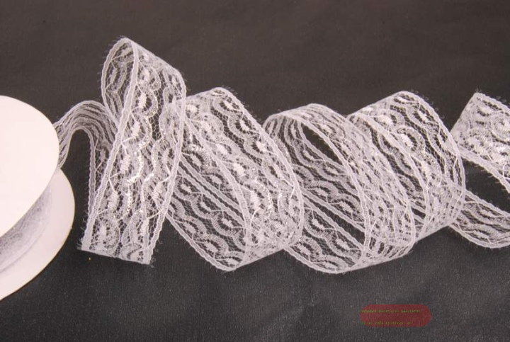 Band 10y/ 25mm, Tüll mit Motiv, weiss/silber